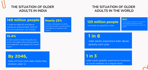 They say that it takes a village to raise a child. To help seniors age gracefully, it takes society, infrastructure, governance, educational institutions, youth, and active adults- all working together. All these cannot be in individual silos. We must work as one team to make this happen. Socialization and human interaction is the key. The human touch, empathy cannot be replaced by technology