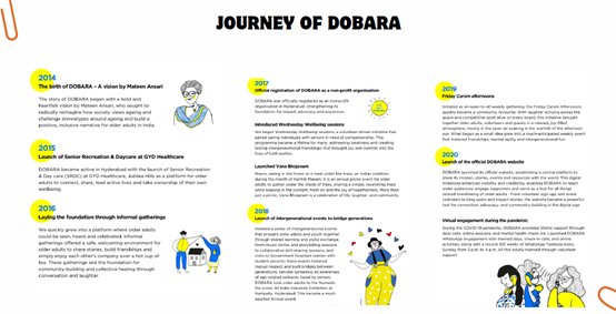 Ms Ansari got the idea of DOBARA when she reached 50. While we prepare for education, career, and family, we rarely prepare for aging. We don't even think of it as a phase to be embraced, celebrated, and lived to the full. This is what drew Ms Ansari into social gerontology, and understanding the social, emotional, and community dimensions of growing older.