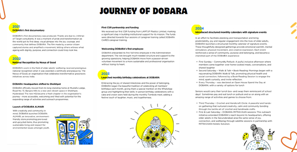 DOBARA has come up with living biographies where the grandparents are present. Youngsters met seniors for every Saturday for over 6 weeks. The living biography essentially meant -we connected with the family, we heard from you, and this is what we have done for you. Such a document of their life has been greatly appreciated.